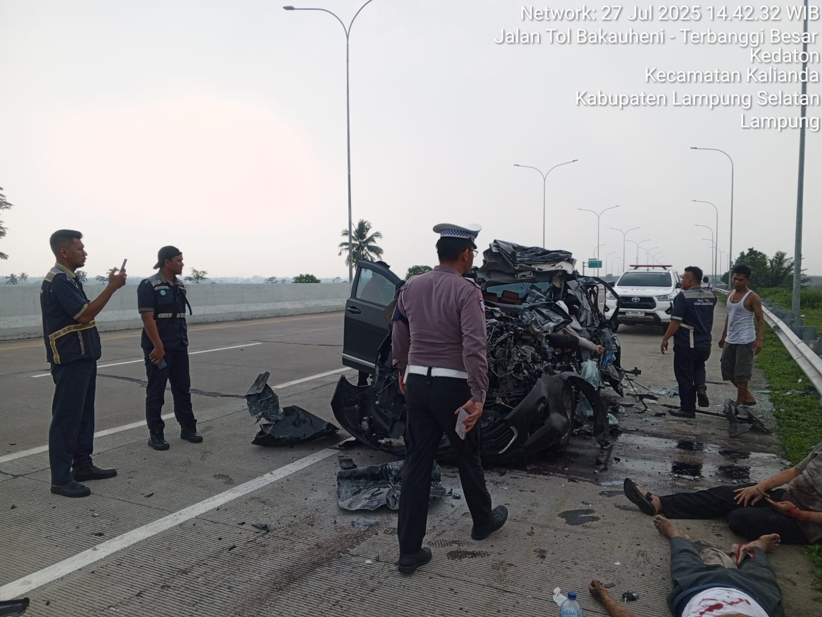 Lampung – Kecelakaan lalu lintas tragis terjadi di Jalan Tol Trans Sumatera (JTTS) Ruas Bakauheni–Terbanggi Besar, tepatnya di KM 38+200 Jalur B, wilayah hukum Polres Lampung Selatan, pada Minggu (27/7/2025) pukul 14.25 WIB.