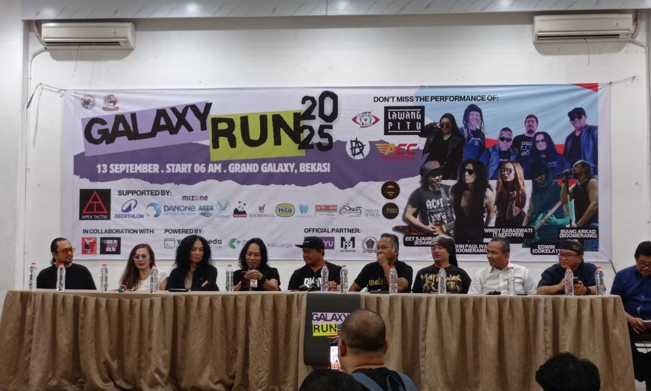 Panitia penyelenggara Galaxy RUN 2025, bersama musisi papan atas, John Paul Ivan Bomerang, Irang Arkad Bomerang, Eet Sjahranie Edane, dan Windy Saraswati Takeover bersama band Lawang Pitu, Asisi Basuki, Trison Manurung, dan Sadtryo menggelar jumpa pers dalam rangka Galaxy RUN 2025, bertempat di Gereja Santo Bartolomeus, Grand Galaxy City, Bekasi, Jumat (22/08/2025).