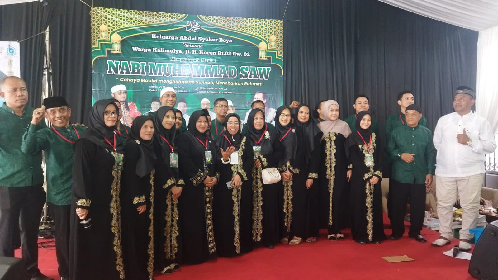 Mataharipos.id , Depok — Memperingati Maulid Nabi Muhammad SAW di kediaman keluarga besar Abdul Syukur Boya, Jln. H. Kocen RT 02 RW 02, Cluster Ammara Kocen Kav.3, berlangsung meriah dengan lantunan sholawat dan tausiah yang menghadirkan ratusan warga serta tokoh masyarakat. Acara yang mengusung tema “Cahaya Menghidupkan Sunnah, Menebarkan Rahmat” ini menjadi momentum silaturahmi sekaligus mempererat keharmonisan warga Kalimulya ( Sabtu,22 November 2025)