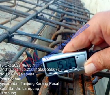 – Indikasi Dugaan Pelanggaran pada pekerjaan Pasangan Besi Balok objeknya adalah tulangan plat lantai tidak sesuai spesifikasi, telah menggunakan tulangan besi 9,22 mm / 9,69 mm / 9,01 mm / 9,05 mm / 8,47 mm, seharusnya menggunakan tulangan besi 10 mm