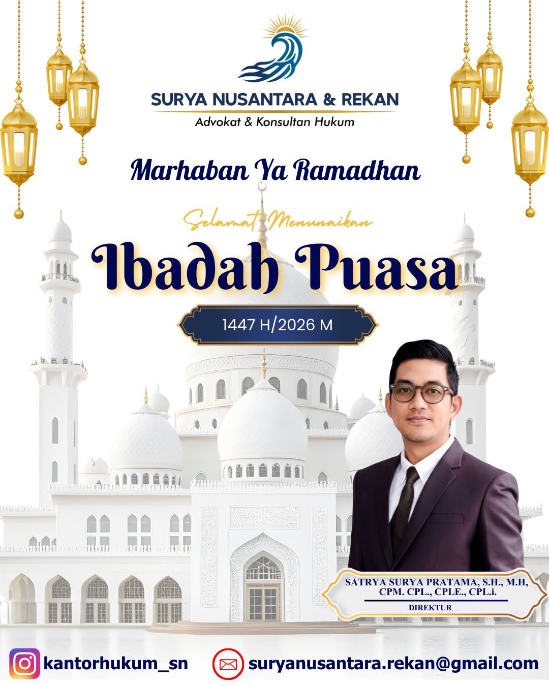 Bandar Lampung – Kantor Advokat dan Konsultan Hukum Surya Nusantara & Rekan menyampaikan ucapan Marhaban Ya Ramadhan sekaligus Selamat Menunaikan Ibadah Puasa kepada seluruh umat Muslim yang menjalankan ibadah di bulan suci Ramadhan 1447 Hijriah/2026 Masehi.